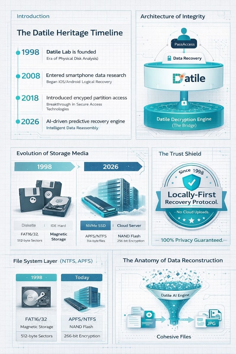 Explore Datile’s 27-year journey in metadata recovery, from MBR and GPT to APFS containers, revealing the tech and AI behind zero-loss data restoration.